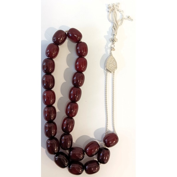 Κομπολόι από ασήμι 925 με μεγάλες λουστράτες οβάλ χάντρες από κεχριμπάρι φατουράν χρώματος κερασιού.